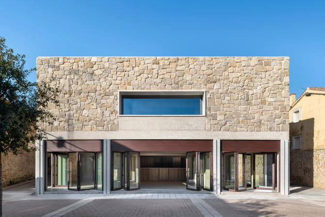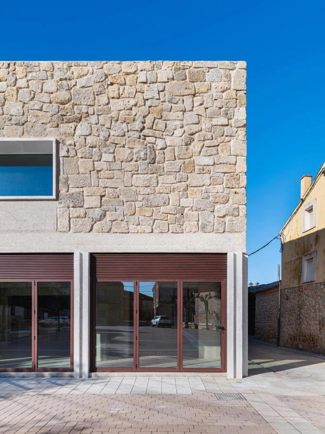 El edificio no engaña con su tectónica. En su resolución, se optó por la materialidad local, por la identidad del municipio, por la economía local, próxima y el oficio vernacular de la construcción con piedra. Obtenida de las proximidades, en las eras, pero también procedente de derribos –conforme a ese sabio entendimiento del aprovechamiento que siempre ha existido en los pueblos castellanos– se procedió a su selección e incluso leve labra de algunas piezas especiales. Su colocación se realiza sobre muros guía interiores, ayudada por diversos elementos prefabricados de hormigón moldeados a poco más de una veintena de kilómetros. Los áridos para el hormigonado, al igual que en otras experiencias, proceden de tierras próximas lo que facilita su proceso de mimetizaje respecto a la tonalidad rojiza de la tierra.
