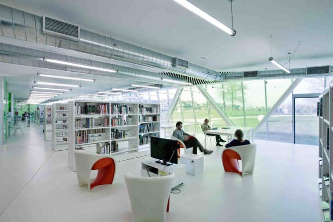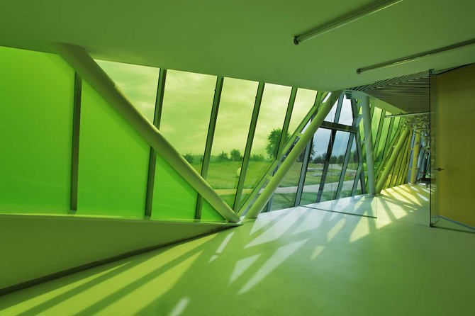 La fachada es a su vez un elemento estructural, conformado por pilares metálicos inclinados que sujetan la losa de cubierta. Desde el interior, el edificio se comprende como un vacío excavado y abierto hacia el norte, en el que se han dispuesto unos elementos “burbuja” que organizan las distribuciones. Estos elementos se construyen en mampara de vidrio-melamina, y buscan una continuidad material con la fachada, formando parte, al igual que esta, de la estructura portante del edificio. Estos subespacios burbuja albergan usos que necesitan de un lugar más reducido y controlado para su funcionamiento: espacios de control, despachos, aseos, almacenes, etc.