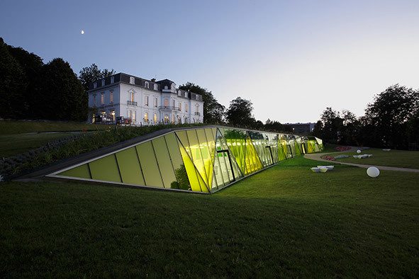 El nuevo Centro Cultural se plantea como una intervención en el paisaje que extiende el trazado romántico del parque hacia la ladera situada al norte del palacio. Se han estudiado las vistas, la vegetación, los recorridos..., integrando la fachada acristalada como un talud más dentro del parque, mediante un lenguaje abstracto que trata de no competir con el lenguaje figurativo del palacio.