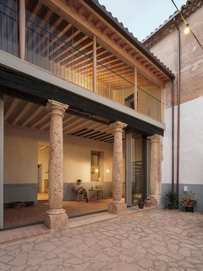 En la experiencia de la casa, caminando por las estrechas calles sorprende la impresionante portada de su fachada, conservada en perfecto estado. En el interior de la vivienda, destaca la organización en tres cámaras longitudinales con gruesos muros de carga, organizados en torno a un patio central. Consta de una galería con columnas de piedra en planta baja y galería de madera popular en planta primera. Estas se ponen en valor, dejando las columnas exentas y situando una galería acristalada retranqueada, fomentando la relación entre el interior y el exterior.