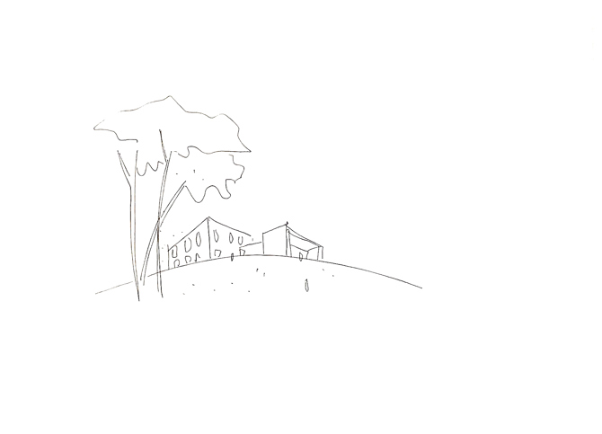 El conjunto se organiza a partir de la construcción de tres volúmenes independientes: el volumen cúbico de la vivienda, un bloque lineal destinado a aparcamiento cubierto, en cuya cubierta se sitúa un mirador sobre el Pardo, y un pequeño cenador que se cubre con una pérgola. Los tres volúmenes estructuran los espacios ajardinados en cuatro bandas diferenciadas: la banda del acceso, con la enigmática presencia de los altos pinos; un patio ajardinado situado entre la vivienda y el mirador, que habilita el acceso a la vivienda; una amplia pradera con la pérgola al fondo, que está profusamente rodeada de arbolado, y el área de la piscina situada en un nivel inferior del jardín, con el objetivo de garantizar la intimidad de los bañistas.