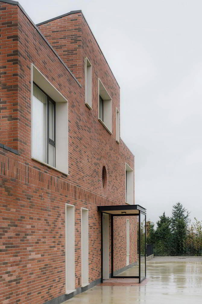 Reutilizando la clásica disposición de casa rural en L, se consigue un recinto exterior protegido a modo de racimo, en el que las piezas se atan entre sí por un techo horizontal que actúa como una gran bandeja sobre la que descansa el volumen principal a dos aguas, y cuya panza protege un espacio abierto generoso, transformando la casa en un pequeño asentamiento que fomenta la vida al aire libre durante los meses de verano. Ladrillos artesanales fabricados en el cercano pueblo de Muriedas se emplean de forma extensiva, apoyando la producción local y produciendo una imagen de algún modo atávica.