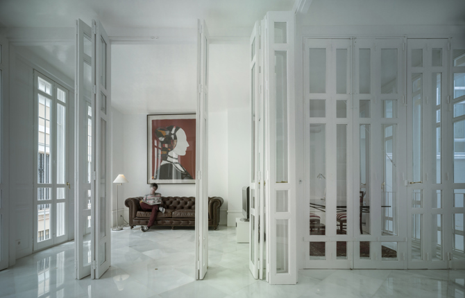 Así surge la oportunidad de generar una piel interior capaz de dibujar ámbitos de diferente dimensión, ampliables y reductibles, según se abren o cierran las hojas de este corazón de la casa, metiendo la luz y apropiándose del patio de maneras muy diferentes, según los usuarios deseen.