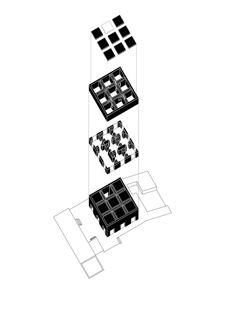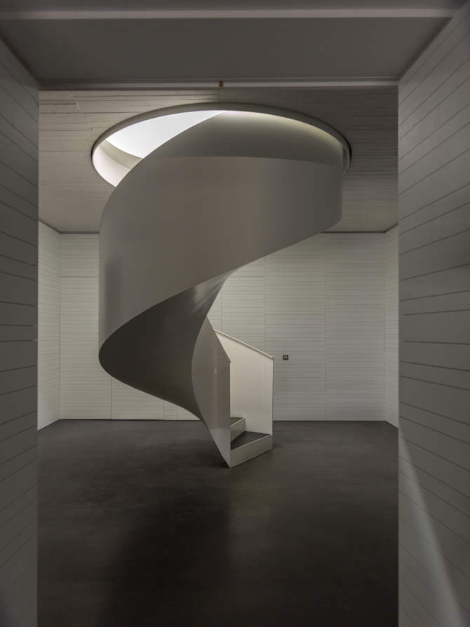 Cada una de las nueve estancias se construye en dos estratos diferenciados: un estrato inferior, formado por un vaso de tablas de madera de roble, donde se ubicarán todas las instalaciones de la vivienda; y un estrato superior, formado por una artesa de hormigón blanco, en la que no se ubicará ningún tipo de mecanismo ni sistema de iluminación.