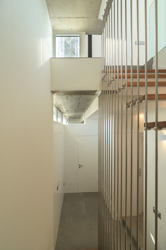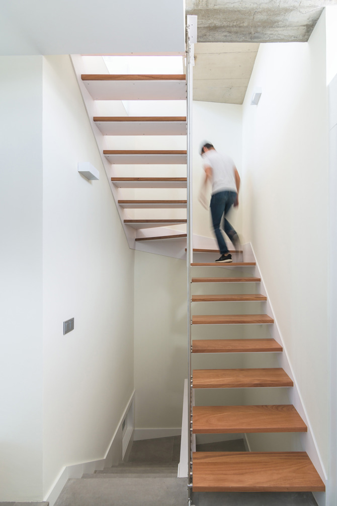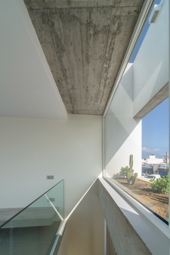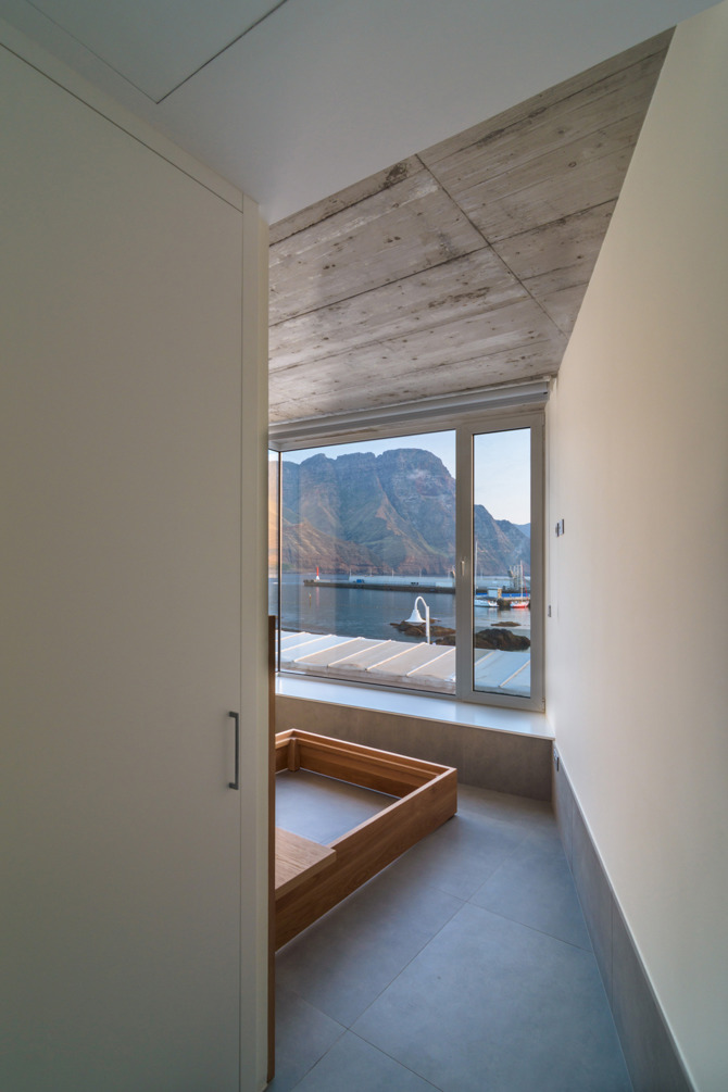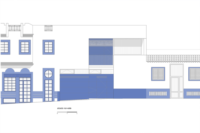 La primera línea de edificaciones blancas y azules, donde se asienta la casa, se erige como un muro continuo de diferentes alturas, en el que, en ocasiones, no se aprecian con precisión los límites entre una edificación y otra. La vivienda pretende formar parte de esa continuidad. En su alzado trasero, asume las alineaciones dadas por las construcciones colindantes, como si el alzado urbano del pueblo, de forma natural, se introdujese en la casa y compusiera su fachada. De esta manera se pretende generar la sensación de que la vivienda siempre estuvo allí, formando parte del barrio y potenciando su atractivo intrínseco. En su alzado delantero, la casa adopta la tipología de fachada impuesta por la normativa local; tres niveles, con un volumen en la segunda planta que sobresale cincuenta centímetros del primero, y el tercero retranqueado del resto de la fachada. En este alzado, a diferencia del resto de viviendas, la casa se abre con grandes ventanales al paisaje privilegiado que le proporciona su ubicación, de manera que las imponentes vistas son la proyección infinita de los espacios interiores. En el interior, en los espacios de planta baja, se ubican un pequeño local comercial y un apartamento vinculado al resto de la casa. En la primera planta se encuentran los dormitorios y el garaje, que se articulan adoptando diferentes formas generadas a partir de la geometría angulosa del solar. En la tercera planta, donde se ubican la zona de estar y la cocina, se genera un espacio único que se abre totalmente a la terraza, creada por el retranqueo de este nivel con respecto a la fachada delantera. En este nivel, la continuidad de los muebles de cocina y el banco de hormigón del salón, que van desde el interior hasta el exterior, generan la relación espacial entre ambos ambientes, llegando a ser uno solo cuando las puertas correderas de la terraza se abren.