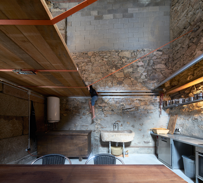 La vivienda se ha articulado en torno a dos espacios principales en doble y triple altura, conectados visualmente en todas sus diagonales y en relación constante con el exterior. En ellos se desarrolla el programa asociado con el día, como comer, cocinar, reunirse, trabajar, jugar, socializar, relajarse, etc. En el volumen integrado situado en la zona oeste, en un ámbito más privado, se sitúan los dormitorios. Finalmente, en el volumen anexo al noreste, se ha ubicado un dormitorio adicional, que es independiente de la vivienda principal. Para conectar los espacios verticales se han conservado las escaleras originales, de peldaños formados por piedras de grandes dimensiones que descargan su peso en el terreno; como antagonista, se ha diseñado una nueva escalera de chapa metálica que parece levitar sobre el forjado de madera. La vieja cuadra se ha convertido así en una casa que se vive como una topografía natural. Una cueva habitada por pequeños salvajes de manera poco convencional. Como en el bosque, en la naturaleza, en el Monte Pindo, uno tiene que moverse mirando al suelo, y hacia arriba, alerta, con precaución. Una casa sostenible como las casas de pueblo, sin imposturas tecnológicas.