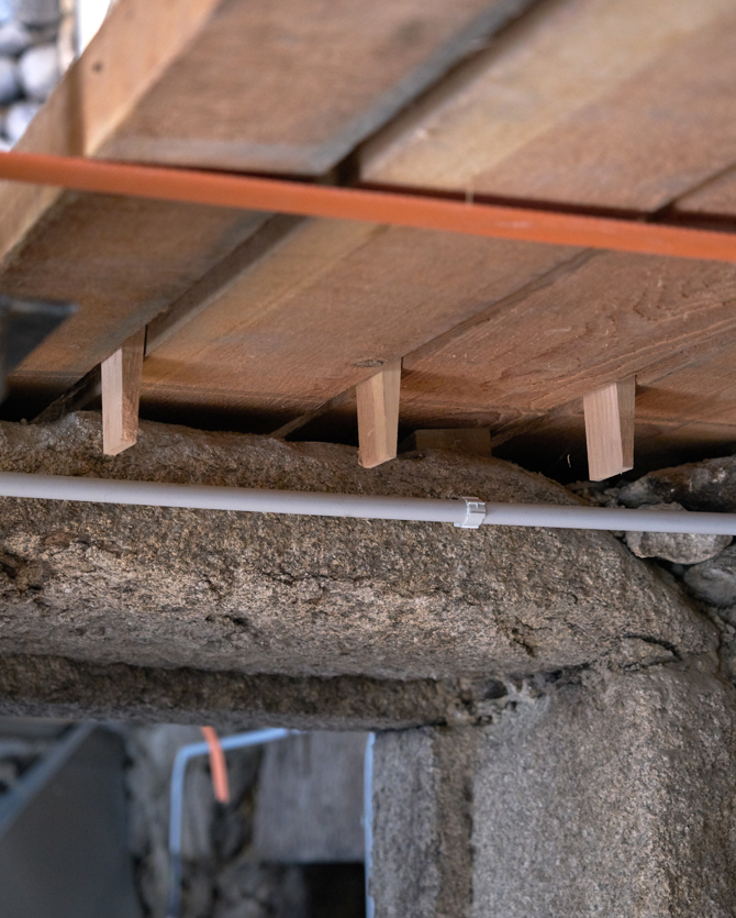 En primer lugar, se realizan aperturas de mechinales en los muros de mampostería a distintas alturas en las que se insertan tres durmientes de sección metálica. Los forjados de tablones de madera de pino se empotran en el muro de fábrica sobre los durmientes metálicos y se fijan a compresión mediante cuñas de madera. Los forjados salvan unas luces de hasta 5,20 metros. Los tablones están sueltos, sin encolar ni machihembrar. Para darles estabilidad se dispone de cinchas de amarre que los envuelven, y estas se fijan sobre los paramentos verticales de piedra mediante un sistema de anclaje con aros de acero inoxidable, haciendo que el conjunto trabaje a tracción.