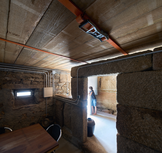Se han sustituido todas las carpinterías exteriores e interiores, que estaban en mal estado o inexistentes, por unas nuevas carpinterías metálicas. Y se han conservado todas las divisiones interiores de piedra, saneando los muros e incorporando nuevos huecos para conectar los espacios entre sí. Además, se han conservado otros elementos de piedra singulares, como las escaleras, la chimenea, el fregadero y una pila.