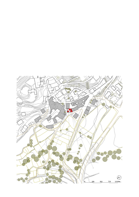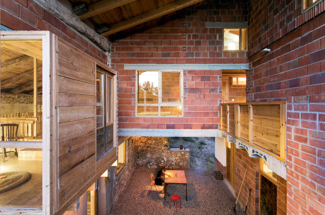 Ocupa un antiguo corral familiar en el que existía una majada, de la cual aprovechamos muros de piedra y vigas de madera. Su geometría determina la inclinación de la cubierta y las dimensiones del patio. En el límite entre el pueblo y los campos, la casa adopta forma de U. Así se abre al paisaje y genera un patio. Una gran cubierta a dos aguas cubre la casa y convierte el patio en un volumen “interior” y a la sombra. El patio es el centro, el espacio más utilizado y polivalente. Desde él se accede a la zona común y a las habitaciones, como en un motel.