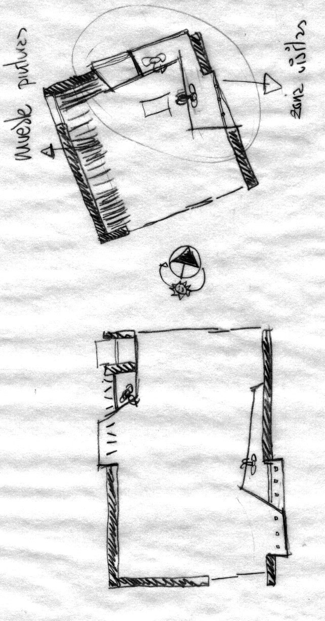 Si el viejo estudio estaba situado en un primer piso con vistas al campo de Mallorca, ahora el estudio mira la tierra a lo más cercano. Los condicionantes de la parcela indican dónde debe colocarse el nuevo estudio, cerca del muro de cipreses, orientado a norte, que protege del viento, y debe el estudio dejar la mayor dimensión posible de huerto, orientado a sur, para poder cultivar y, la circunstancia más importante, incluir el movimiento que se realiza de la vivienda al pozo para coger agua potable. Este uso, de ir y volver, será el nuevo centro del estudio. A partir del pozo se coloca a sus lados dos volúmenes que convierten este lugar en un patio recogido entre la vivienda y el huerto. El estudio arropa, ampara, protege el huerto y a la vez lo ojea.