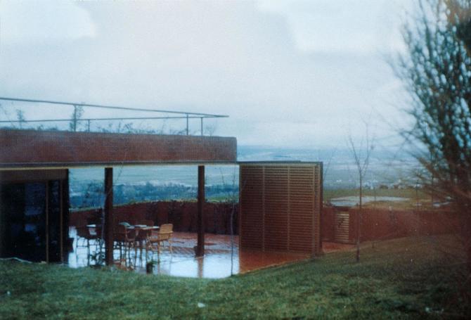 Construcción: estructura mixta de hormigón y acero. Cerramientos de ladrillo con revestimiento de plaqueta. Lo bueno de hoy día es que podemos hacer casa abierta, abierta, que se cierre, cierre. Parece que es una tontería pero así es, esa es la gran novedad. Estar dentro de tu casa y que en ella penetre el jardín, que no pises la raya al pasar sobre ese dentro-fuera. Vienen después todas esas otras cosas de situación de cota para vistas, dominio, recogimiento, etc.; esas otras cosas de orientación y tantas otras de todo: seguridad.