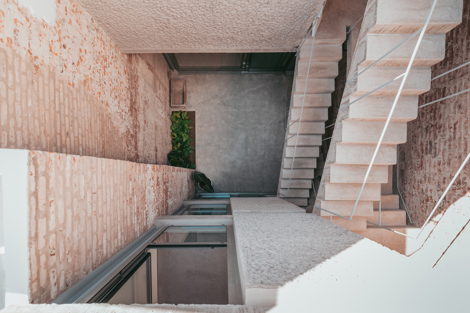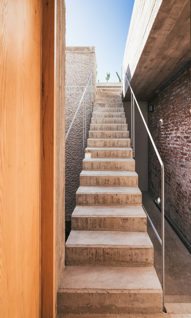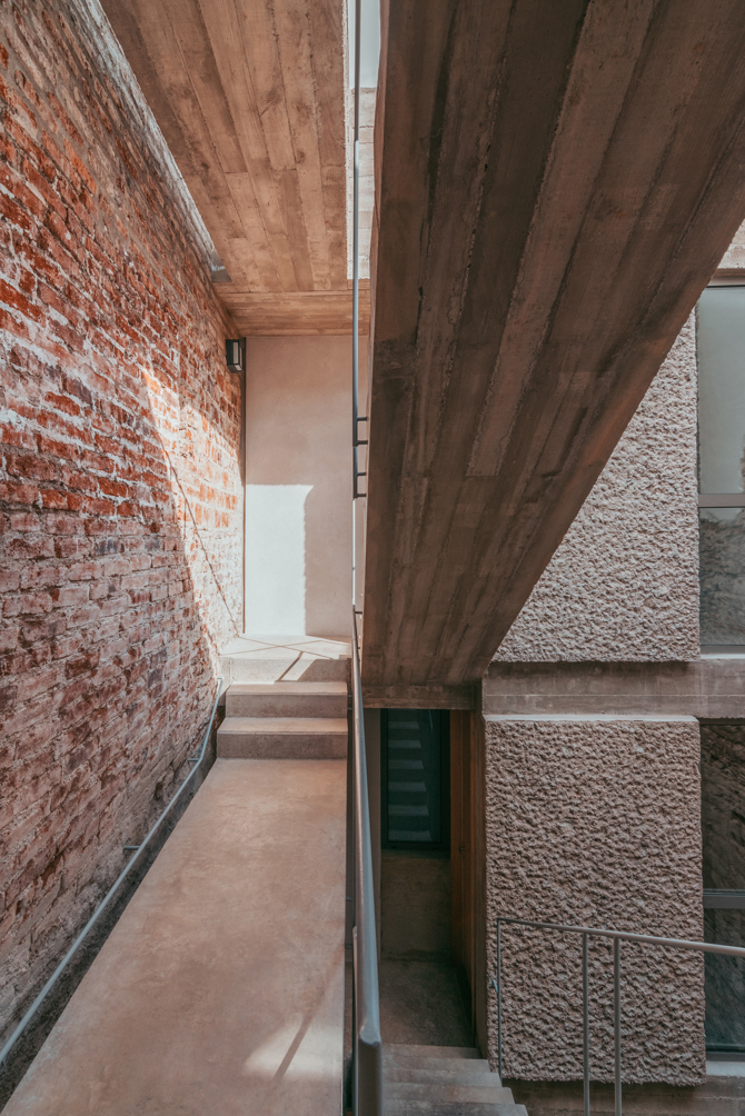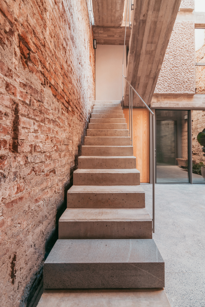A nivel material, los muros existentes que definen el cerramiento de la casa se proyectan vistos o acabados con mortero de cal, según los casos. La nueva construcción se ejecuta en hormigón visto, con distintos acabados.