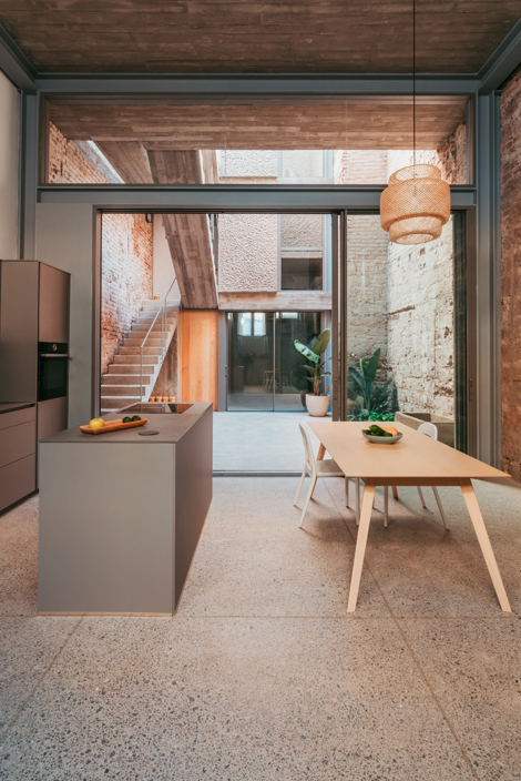 El reducido patio de ventilación existente se amplía, pasando a ocupar toda la crujía transversal de la edificación –de muro a muro medianero–, constituyéndose como verdadero centro tipológico de la vivienda.