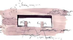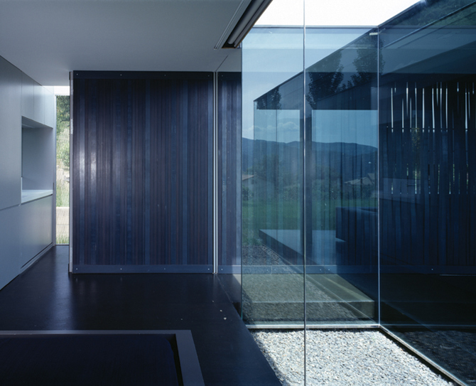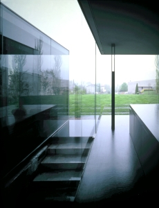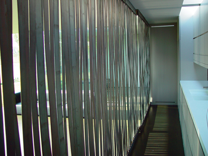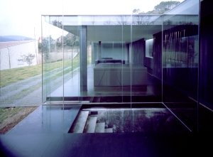 El espacio interior se adosa a la pared fina o gruesa –si consideramos su sección con todos los servicios agrupados– y es un espacio tripartito o único según posicionemos los cerramientos de cristal de la hendidura que cambian la percepción del espacio en cuanto a sus medidas y a la relación vacío-lleno con cualidades de exterior interior.