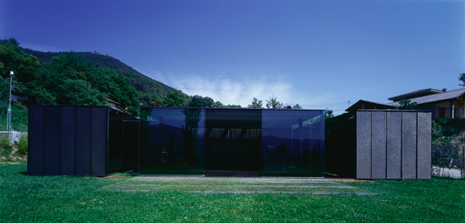 Construida en taller se trata de una caja de paredes finas y cristales protegidos con malla metálica que se abre al exterior y crea hendiduras para conquistar el aire. La caja se apoya sobre muros que configuran un recinto semienterrado que contiene el garaje.