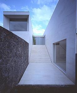 La escena de un paisaje que subyuga precisa de una casa mirador. La casa levantada, suspendida, y tranquila, lo otea. Se accede a ella por entre el vacío de los dos volúmenes que la definen.