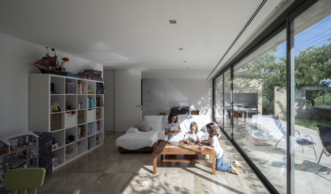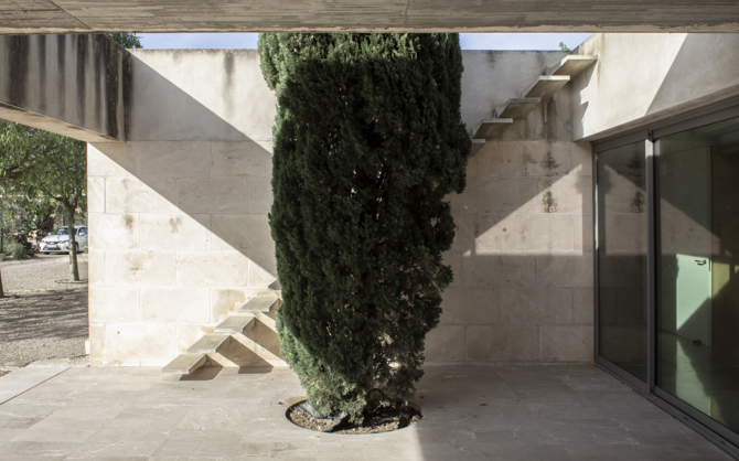 Huyendo de las aproximaciones formales, la vivienda asume el valor de la relación con el lugar, ubicándose longitudinalmente en el fondo de la parcela, en perpendicular al camino de acceso y liberando el máximo de espacio de cultivo, aprovechando el molino y alberca próximos. Esta relación se cromatiza con el uso del marés, presente en la mayor parte de construcciones agrícolas de la zona, que texturiza la volumetría exterior. Se compone de una planta baja edificada a cota del terreno, estructurada a partir de dos grandes patios, uno a cada extremo, que tamizan la relación con el paisaje más próximo.