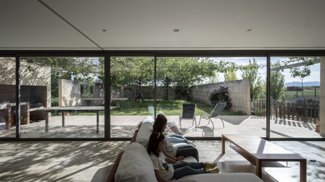 La horizontalidad del paisaje solo se ve puntualizada por los conjuntos de torre de molino para sacar agua y alberca para almacenarla. Una arquitectura contemporánea que entiende que, para serlo, ha de incorporar todos los atributos de la arquitectura tradicional (patios, muros, celosías, parrales…).