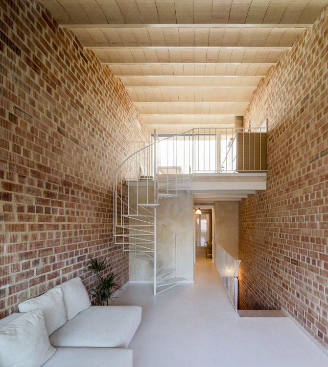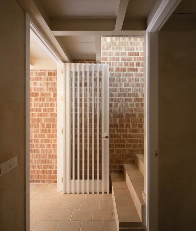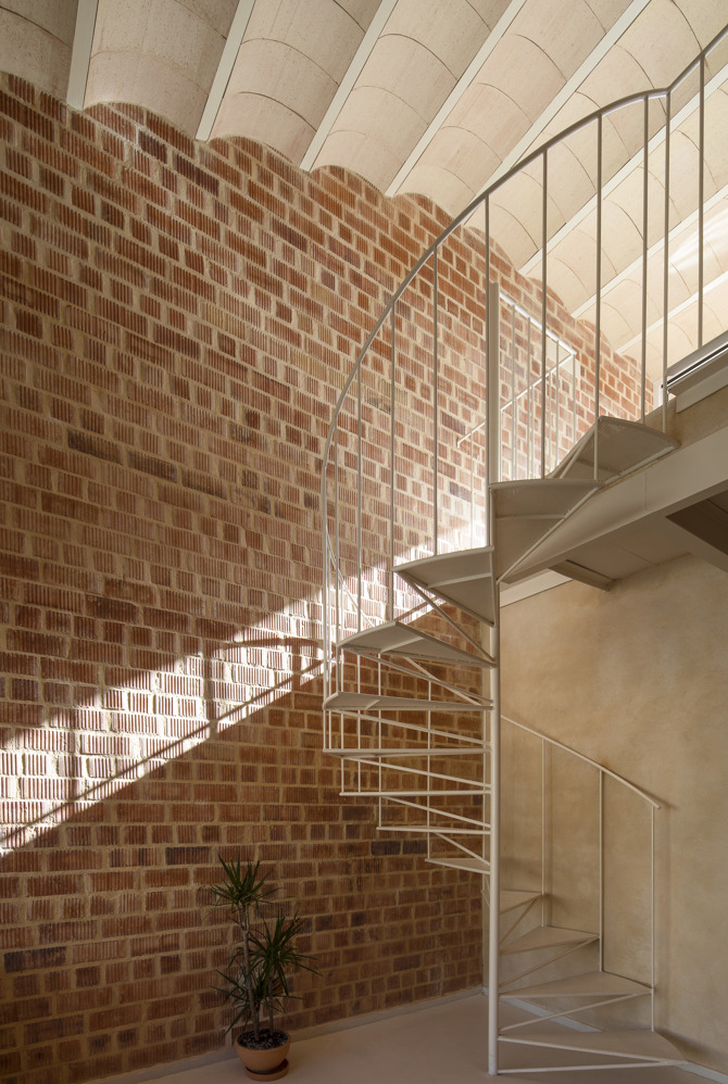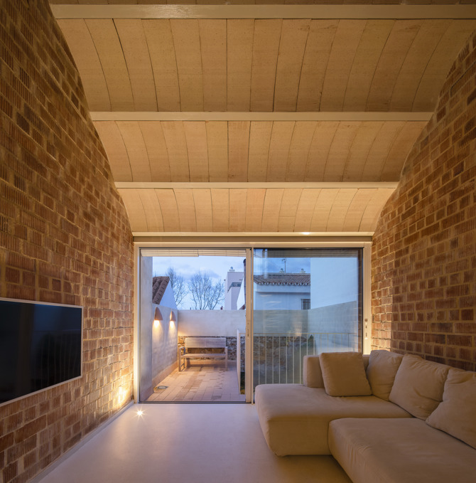 Por otro lado, la decisión de situar las zonas de noche y de servicio en los niveles inferiores de la vivienda permitió incluir un espacio singular de mayor altura que conectara visualmente todos los espacios exteriores de la parcela, utilizando para ello un gesto directo y continuo formalizado como una bóveda que abraza y descomprime simultáneamente el espacio. A su vez, bovedillas cerámicas de barro claro, utilizadas como encofrado perdido de la cubierta de la vivienda, completan la envolvente interior sin más revestimientos que los escasos revocos de cal natural que recubren las paredes provistas de instalaciones de los núcleos húmedos.