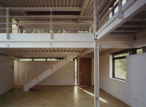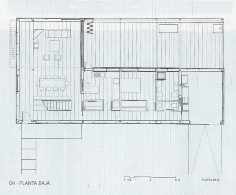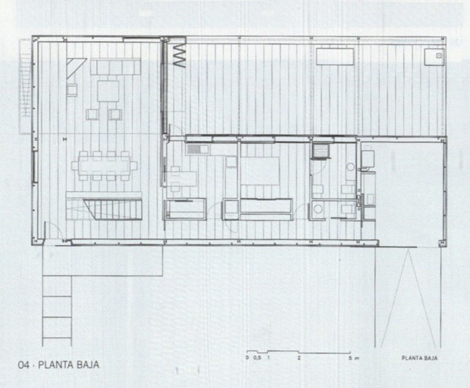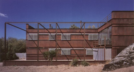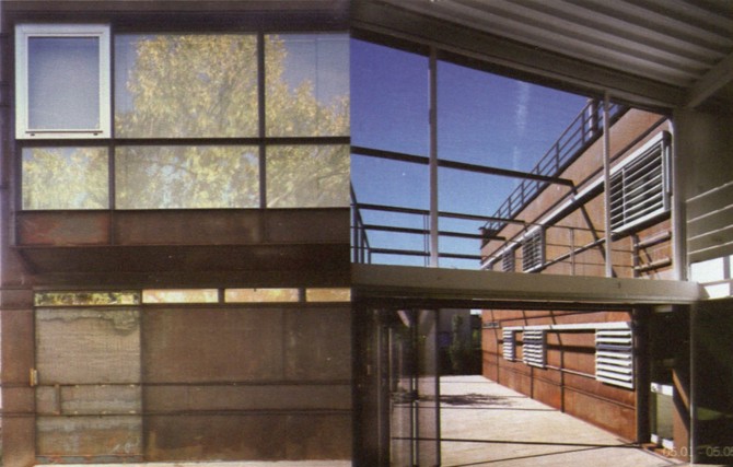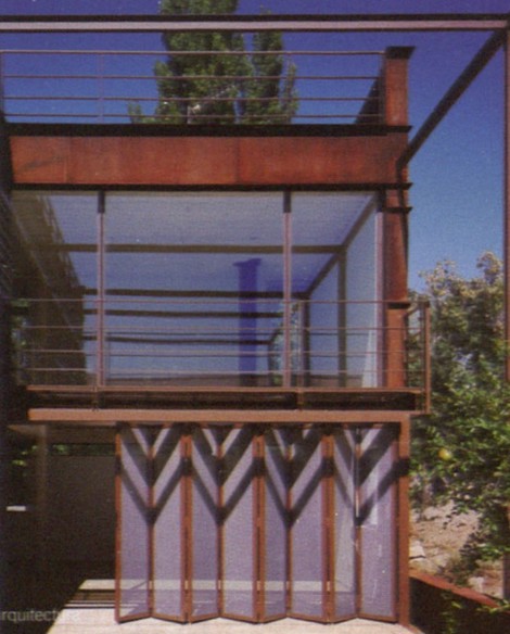 La principal reflexión, que planeó con persistencia durante el desarrollo del proyecto de la casa de chapa, consistió en la búsqueda de la supresión absoluta del material de acabado, tanto en el interior como en el exterior de la casa. El acabado, en sentido lato, denuncia un tipo de construcción con voluntad de ser ocultada, sea por su extrema pobreza o por su fehaciente indignidad. La integración de materiales que permitieran construir la obra gruesa y, simultáneamente, pudieran manifestarse como materiales de obra terminada, denotaba algunos términos de contemporaneidad que nos interesaba resaltar en el discurso constructivo, tales como montaje e industrialización. Se pensó por ello que, en el muro de cerramiento exterior, que no fachada, el paramento exterior de chapa de acero corten, y el interior, un tablero de madera tipo Encopin, fueran materiales que pudieran servir al mismo tiempo de encofrado perdido para el alma del muro, un relleno de hormigón aligerado de arlita. Durante la obra se produjeron algunos cambios el tablero de madera interior se sustituyó por otro de cartón-yeso hidrófugo, y el aligerado de arlita se transformó en aligerado de bolas de poliestireno extrudo. Este muro sándwich, realizado in situ sin grandes apoyos técnicos, se construyó de fuera a dentro. EI palastro exterior de acero corten de 5 mm de espesor, montado en bandas de altura constante, tiene, en cambio, dimensiones variables en longitud, primando el máximo aprovechamiento de la chapa, sin producción de retales, y un peso que hiciera posible su manipulación por solo dos hombres. Estas chapas se atornillan permitiendo dilataciones sobre una subestructura de perfiles en “T”, y en “L” en el caso de las ventanas, que a su vez están soldados a una estructura vertical de tubo que cuelga de los forjados. En el envés de la chapa oxidada se provectó espuma de poliuretano y se montaron los paneles de cartón-yeso, a medida que se rellenaba el interior de hormigón aligerado. La fenestración muestra una dualidad de materiales que expresa un doble sistema constructivo, ya se trate de huecos fijos o practicables.