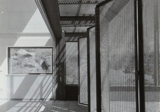 Las ventanas fijas se manejaron como parte inseparable del cerramiento, construyéndose con perfilería de acero al exterior y piezas de ajuste interiores de DM. Los huecos practicables, así como las contraventanas de seguridad que los protegen, se realizaron en aluminio anodizado. El gran ventanal sur del salón se protege mediante una pasarela y un cerramiento tipo fuelle en chapa estirada en frio que tamiza la luz y permite la ventilación continua en verano. Las carpinterías de la parte inferior del ventanal se proyectaron para poder ser retiradas en su totalidad y permitir una extensión completa del salón hacia el patio.
