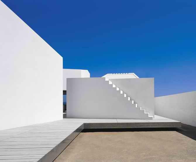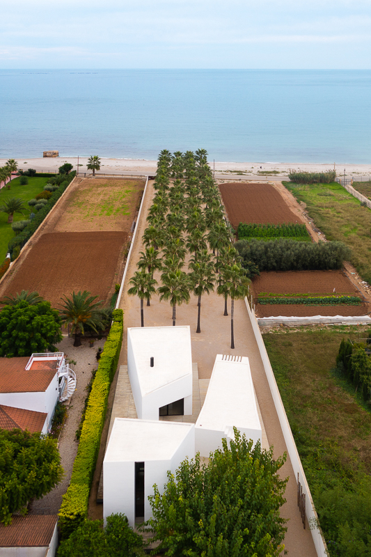 El vacío central se convierte así en el espacio principal de la vivienda, un espacio tenso conformado geométricamente en su parte superior, a través de los cuerpos opacos altos de los diferentes pabellones y en el plano del suelo hasta la altura de 2,10 m en un lugar continuo que relaciona los distintos espacios interiores en sombra con las visiones del mar, el fondo vegetal y las zonas de estancia sobre la plataforma.