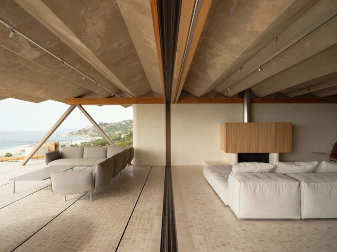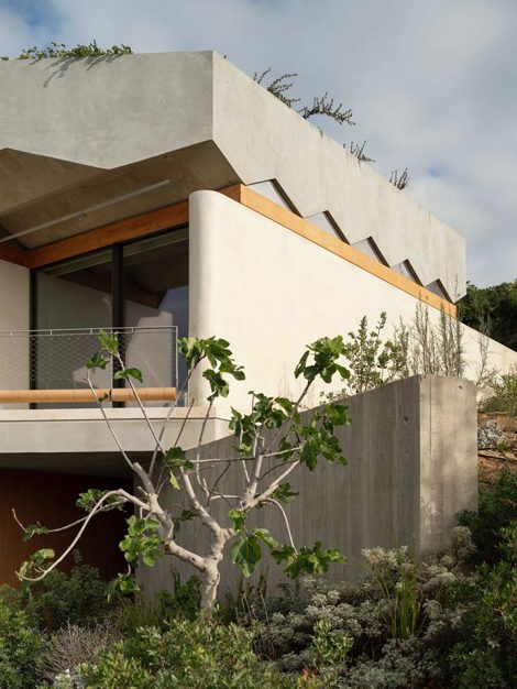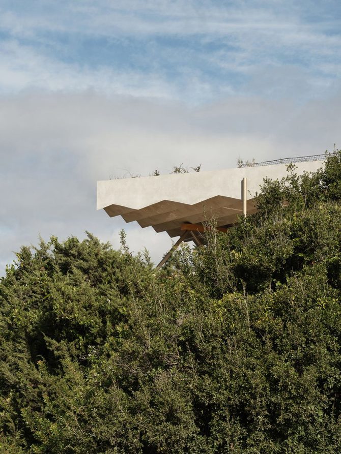 La materialidad dificulta la visión de la casa desde el mar, mimetizándose con los colores del entorno natural. La vegetación autóctona se planta para reconstruir el cuerpo vegetal y reducir la carga térmica de la vivienda.