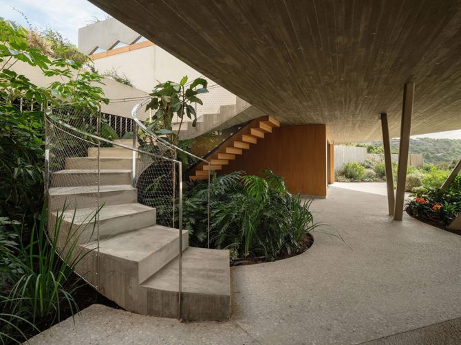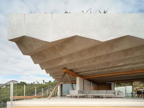 Los muros paralelos organizan la planta de la vivienda y gestionan los vientos cambiantes. El volumen principal de la vivienda se eleva incrustándose en el terreno y se asoma al mar, con una cascada de gradas y escaleras que permiten el acceso a la piscina y al terreno.