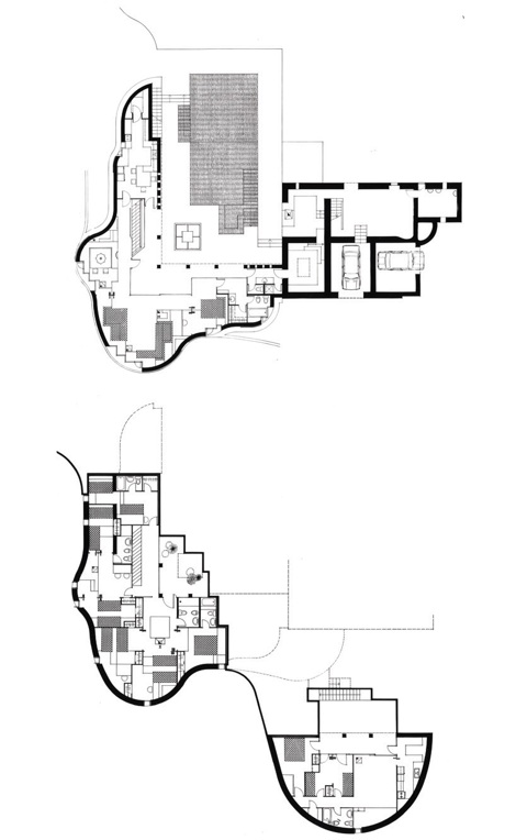 La nueva edificación se desarrolló en dos plantas muy cerradas a la tramontana y abiertas al sur. La superior colaboró con la masía en la definición de un espacio intermedio muy protegido y la planta inferior siguió el mismo esquema y también vivió de un patio iluminado y ventilado cenitalmente. Un pequeño apartamento para el servicio, situado en una posición ligeramente apartada, se planteó de la misma manera.