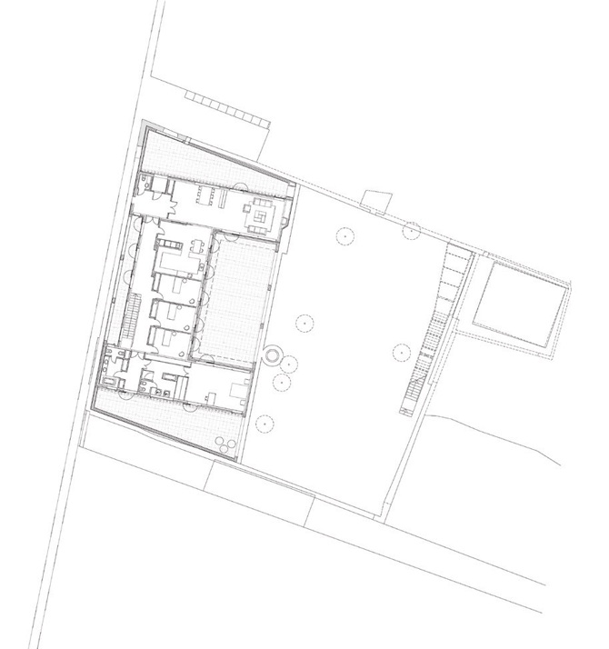 La casa Salvans se construyó en un magnífico huerto rodeado por un muro de piedra que a veces aguantaba las tierras exteriores, otras veces las propias sobre las vecinas y en la zona más alta giraba sobre sí mismo y se convertía en aljibe. En el único punto donde coincidían los desniveles exteriores con el plano horizontal interior estaba situada la puerta de acceso que se conservó en el proyecto.