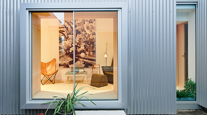 Los volúmenes que forman la casa se relacionan visualmente a través del patio. El diálogo con el jardín exterior se produce de manera contenida con unas aperturas puntuales y acotadas. Desde el interior, se mira hacia un exterior (el jardín) y a la vez hacia un interior que es un pequeño paisaje exterior (el patio). El tamaño de cada una de las cuatro piezas responde al programa que alberga: el primero, de acceso, acoge un espacio de lectura y música y en su doble altura el estudio. Un segundo volumen para la cocina, comedor y sala. El tercer y cuarto volumen albergan las habitaciones. Todos ellos quedan conectados mediante unos espacios de transición a modo de pasarelas.