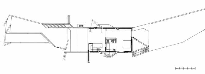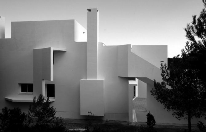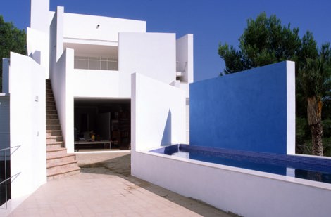 La vida interior está protegida; los patios –cerrados de las vistas exteriores– son abultamientos, dilataciones de los muros. Cuatro aletas se proyectan hacia fuera para recoger las divisiones temporales entre las terrazas y los espacios interiores. La piscina es una bañera gigante en un estar sin techo.