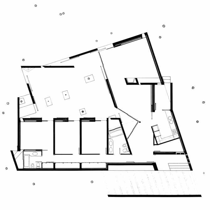 Los muros van dejando entre ellos estrechas aberturas por donde ver los pinos y arbustos del terreno y las vistas a la costa. Estos muros dan privacidad a la casa, protegiéndola de la vista de los viandantes que pasan por la orilla del mar. Para aumentar esta privacidad, y para ganar un poco de vista, la casa y el patio están levantados unos 60 cm por encima del terreno natural. A pesar de la precisión con la que se habían situado los pinos, no se observó que uno tenía una rama torcida y se ha tenido que plegar uno de los muros del patio y acoger esa la inclinación del pino.