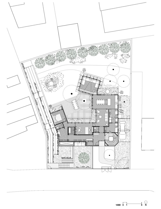 Los clientes querían una casa con rincones, luminosa, sostenible y con un ambiente cálido. Desde un inicio declararon su interés en cuidar ellos mismos de su casa y evitar excesivos automatismos eléctricos. Se planteó, pues, una casa de fachada discreta, que se mira a sí misma y que se organiza alrededor de un patio arbolado abierto a sur, a un jardín y a las vistas. Para su construcción se empleó una estructura maciza de madera contralaminada combinada con delgados perfiles metálicos. Este sistema eficiente, ligero y cálido, se trabajó como un delicado mueble sobre un templo pétreo para practicar yoga, de modo que sus detalles precisos y cuidados estuvieran a la altura de la sensibilidad de sus habitantes. La estructura está completamente revestida con aislante térmico en el exterior y con un revoco con pequeñas piedras incrustadas y de una textura similar a la de las casas más antiguas de la zona. Hacia la calle la casa se presenta prácticamente ciega, y diferencia claramente el acceso público de la sala de yoga del privado de la casa. El centro de yoga se abre hacia la calle mediante dos grandes patios escalonados y cercados por una barandilla ligera, que hacen las veces de lugares de encuentro y de espacios de transición entre el barrio y el centro. La sala de yoga es un espacio diáfano y profundo, iluminado lateralmente por una secuencia de ventanas y cenitalmente por un lucernario circular al fondo de la sala.