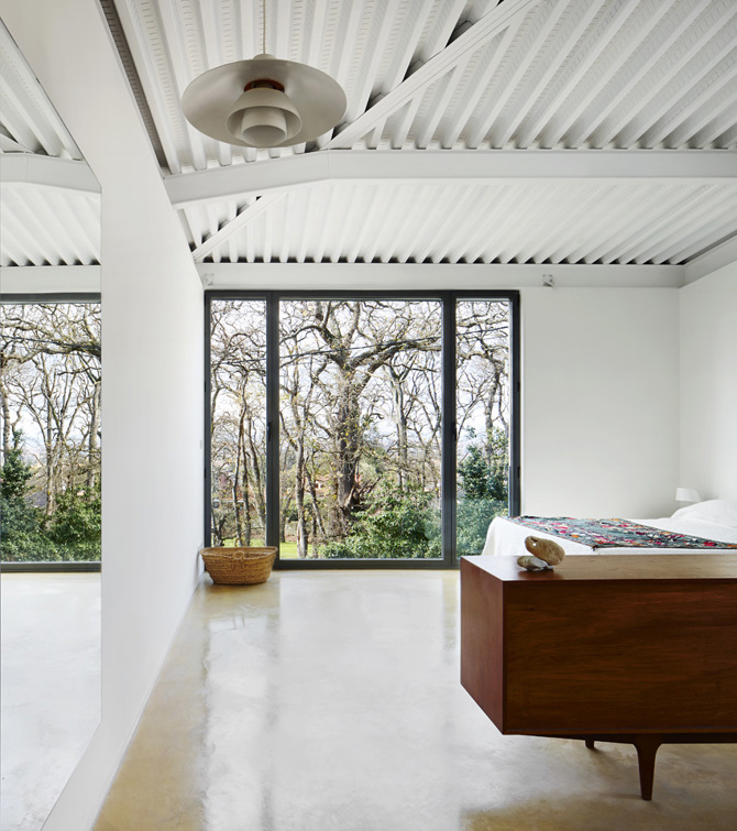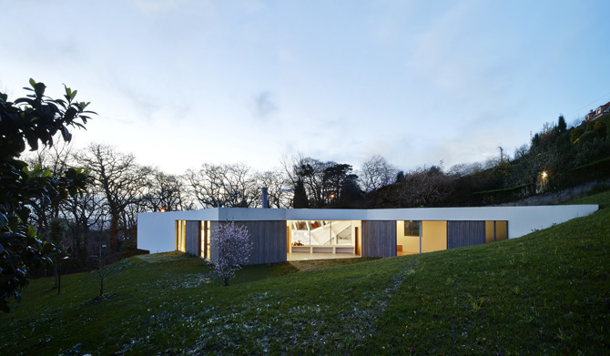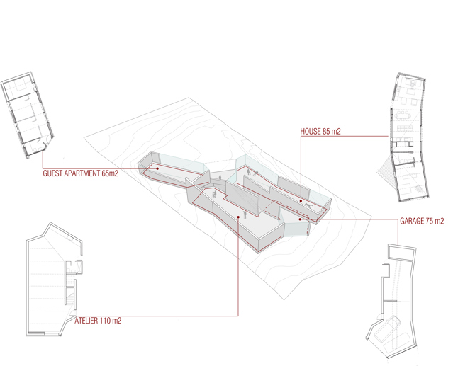 La propuesta hibrida dos tipologías clásicas: la casa moderna y la nave industrial con lucernario lineal orientado al norte. La especificidad del programa, con cuatro unidades autónomas pero interrelacionadas –casa, apartamento de invitados, taller y garaje–, junto con la pendiente del terreno, diseñan el marco en el que integramos ambas tipologías en un único volumen. Esta integración modificó el uso regular de algunos de los espacios del tipo original en base a la nueva relación con su entorno inmediato.