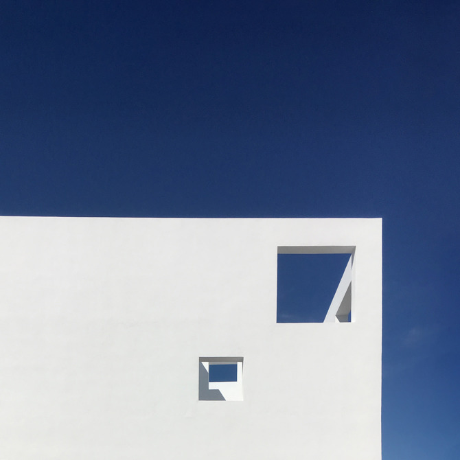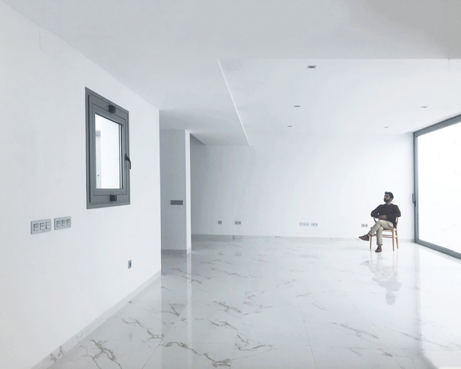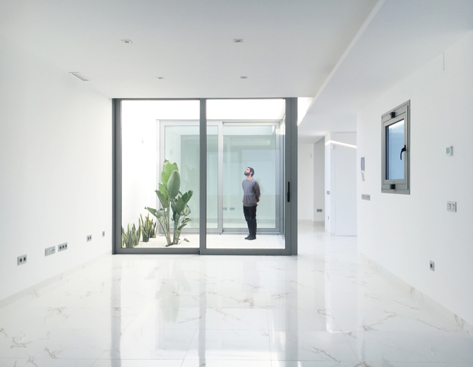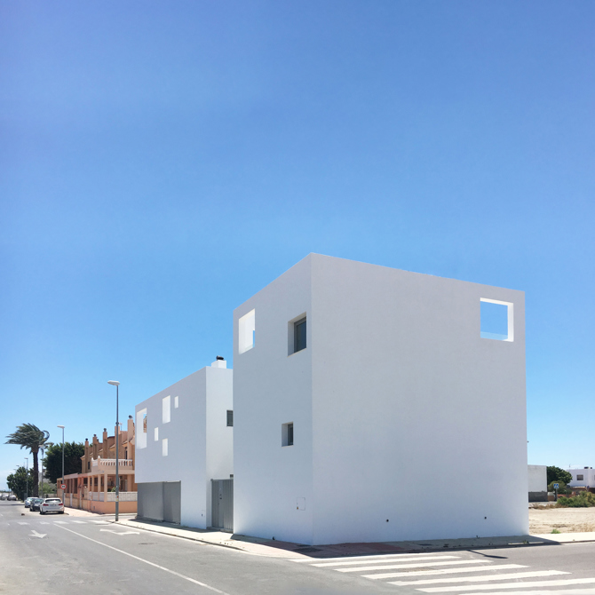 El concepto de bunker queda reflejado también en el aspecto exterior. Las falsas fachadas de hasta seis metros de altura dotan de unidad al proyecto, los huecos puntuales protegen del ardiente sol de Costacabana y enmarcan vistas puntuales. Un acabado blanco con un revestimiento continuo hacen que estas volumetrías evoquen de cierta manera a las viviendas mediterráneas tradicionales de la zona.