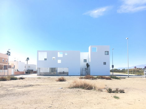 Dado que nos encontramos en el límite del barrio, el entorno inmediato no invita a ser contemplado. Por lo que se busca un proyecto intimista, unas viviendas que se miren a sí mismas, fomentando la vida familiar entorno a los patios interiores y hacia nuestra propia arquitectura. Sin embargo, al alcanzar la planta cubierta solarium disfrutaremos de un gran espacio abierto con vistas al Cabo de Gata.