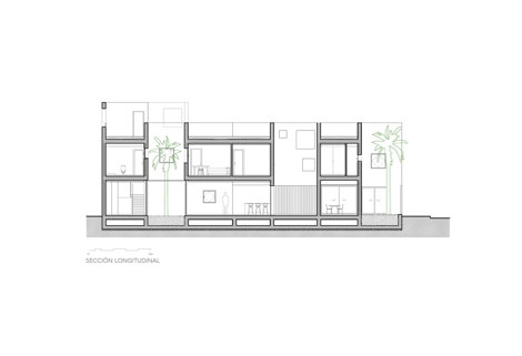 Por lo tanto, las Casas Costacabana se desarrollan entorno a patios, y colocando los usos más públicos en el perímetro, haciendo de ellos unas barreras naturales que protegen a los salones de cualquier relación con la calle y abriéndolos a su vez a los patios internos.