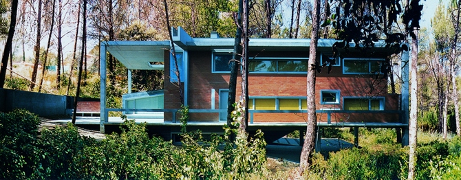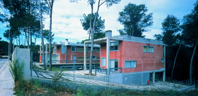 Ideas de la misma fuerza expresiva habíamos encontrado en la serie Salto al vacío de Ángeles Marcos (Puente 1986). Las casa M&M se construyeron con este mismo principio. El proyecto de las casas M&M, como las llamamos en el despacho, se remonta a 1999 . Unos amigos nos ponen en contacto con tres arqueólogos, profesores todos del Departamento de Prehistoria de la Universidad de Bellaterra, que querían hacerse una casa. Llevaban varios años viviendo juntos. Desde los laboratorios de la universidad donde tienen sus despachos veían la riera de Malena, un espacio natural protegido, y, algo más allá, algunas viviendas entre los pinos de una urbanización. Nos pidieron que fuésemos con ellos a visitar la zona.