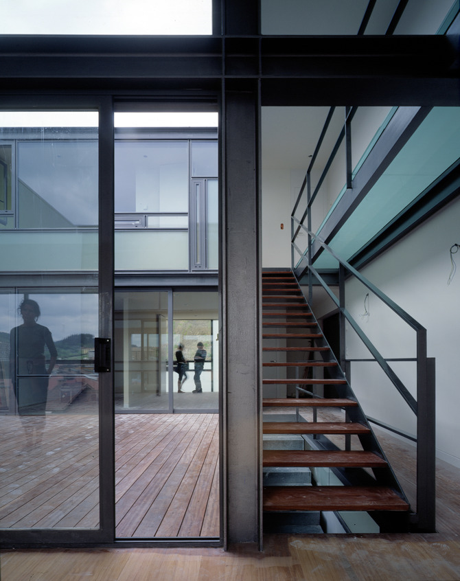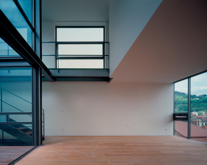La estructura fue, por tanto, una cuestión a priori, que debía permitir conseguir una planta de 16 x 16 metros sobre un plano de apoyo de tan solo 5 x 10 metros. La estructura adoptaba un esquema arbóreo y necesariamente muy ligero, ganando dimensión mediante codales y voladizos, para construir una casa en el aire. Estas dos casas pareadas se elevan por encima de los tejados de los edificios próximos y gozan de lejanas vistas del monte Txindoki.