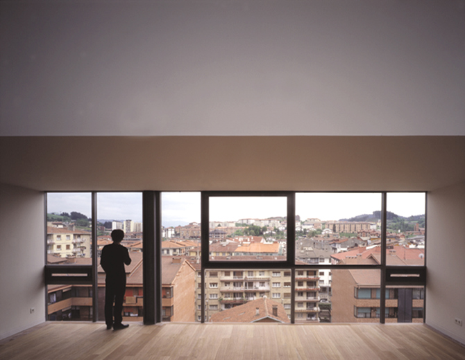 El proyecto evita el enfrentamiento con un terreno, que augura dificultades. En otras localizaciones de Guipúzcoa se presenta el mismo problema de edificar en terrenos muy escarpados, con edificios que desean alcanzar el suelo mediante un podio o basamento, lo que les otorga gravedad; sin embargo, por el contrario, estas viviendas persiguen la levedad. El volumen que flota se relaciona con el aire, con el cielo, de manera que su superficie adopta el color gris de la luz del norte. Persiguiendo la idea de elevación se proyecta un sistema constructivo ligero, que permita amplios voladizos y que libere la planta de garaje en lo posible. Se produce por tanto una transición de esfuerzos desde la estructura-árbol a la casa-tubo que obliga a un cambio de escala en la estructura, manifestándose en unas potentes vigas que recogen los soportes de fachada.
