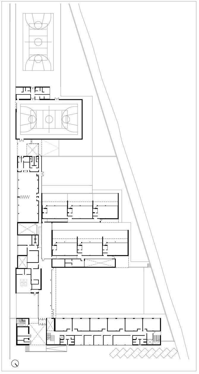 El proyecto desarrolla un colegio público, de infantil y primaria, organizado mediante una tipología en peine. Un cuerpo longitudinal perpendicular a la calle enlaza cuatro módulos transversales. El primero, de dos alturas, alberga las aulas de primaria; su extremo se fractura generando un gran umbral que articula el acceso y la biblioteca, permitiendo su uso independiente. Dos pabellones posteriores, en una sola planta, acogen educación infantil en relación directa con el comedor, minimizando recorridos. El último módulo corresponde al gimnasio, vinculado a la pista deportiva exterior. La organización distingue áreas docentes, administrativas y espacios comunes, con trazas claras que facilitan el uso diario, la seguridad infantil y las futuras ampliaciones.