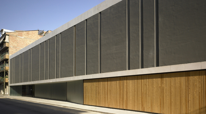 Todo el edificio se construye con bloque de hormigón blanco con junta continua vertical, y una serie de celosías también de hormigón proponen transparencias entre los espacios de trabajo y los de paso. La fachada a la calle se resuelve enfatizando su opacidad para remarcar la voluntad de abrirse al interior.