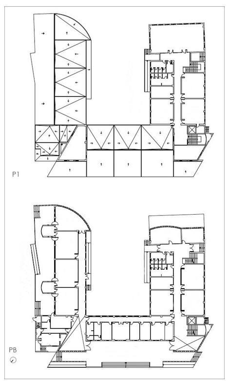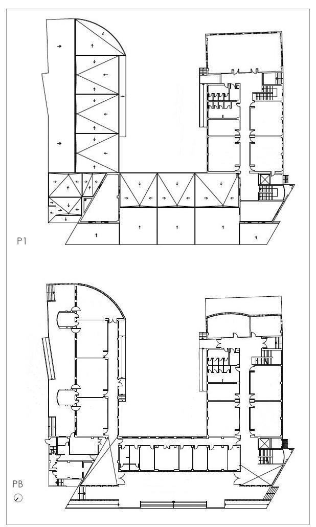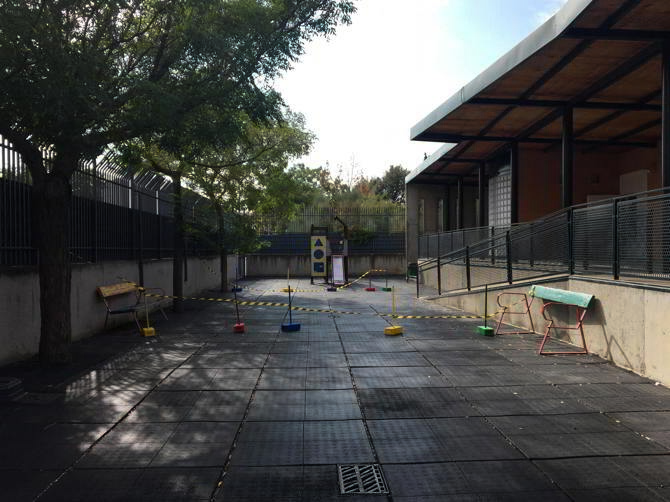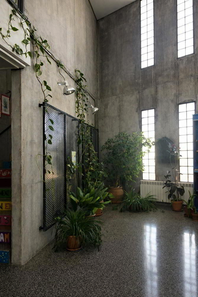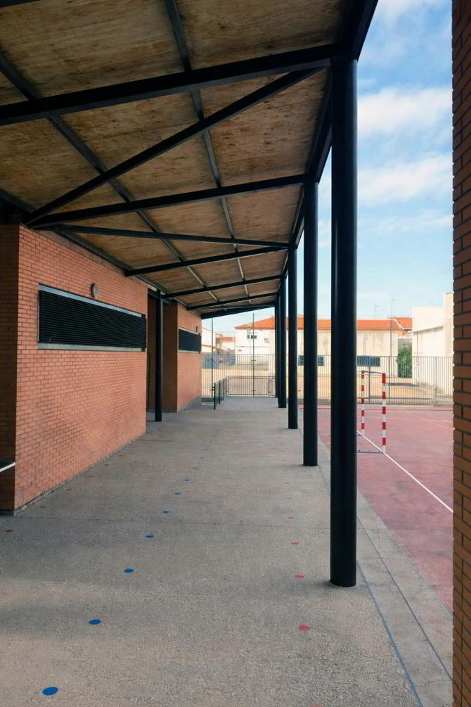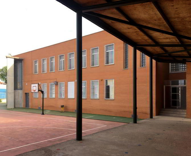 Nos encontramos ante un proyecto que compagina una idea compositiva muy clara con una materialidad muy compleja: tres piezas dispuestas en U para aulas y despachos, en ladrillo caravista rojo, a las que se superpone, por una parte, en la fachada principal, un dispositivo de entrada, accesos y núcleos de comunicación vertical en hormigón armado visto con clara vocación brutalista, la cual salpica asimismo los remates de las alas, con muros de pavés. Por otro lado, se le adosan los porches del patio central y de la zona de educación infantil, en estructura metálica y madera. Materiales de alta resistencia y durabilidad, aunque un tanto duros, que se compensan con el tratamiento de los interiores, bañados por la luz, los reflejos y los colores.