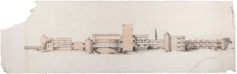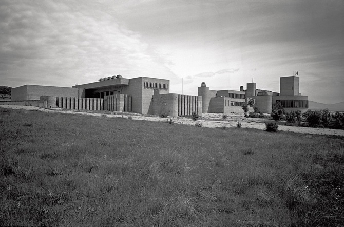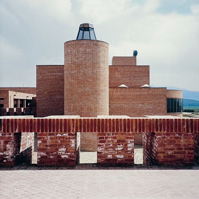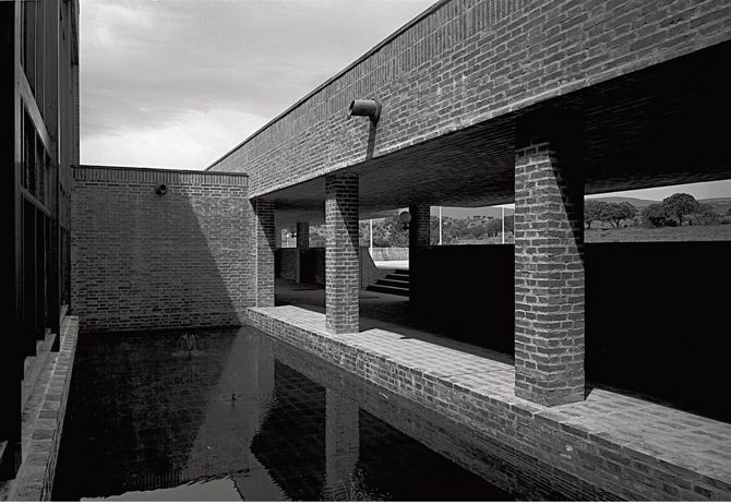 La residencia y centro de estudios, lejos de la ciudad, en un ambiente de serenidad y retiro, nos sugirió cierta analogía con un monasterio. Por otra parte, la necesidad de una torre para depósito de agua, la gran rotonda de la sala de control, el edificio de fuerza con su masa compacta y los terraplenes y muros de contención invitaban a un juego de volúmenes, fuertes y expresivos, evocadores de la arquitectura militar medieval. Procuramos mantenernos en una actitud contenida, tratando de equilibrar lo racional y lo emotivo; pero el resultado fue una arquitectura expresionista, cargada de evocaciones.