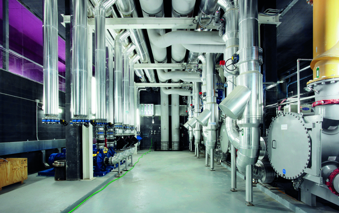 La disminución del gasto de energía es de un 20% y unas 20.000 t de reducción de emisión de gases respecto a los sistemas convencionales. Se compone de un gran depósito semienterrado de almacenaje de agua (11.000 m3) y un cuerpo adyacente que contiene la maquinaria. En la planta sótano segundo se ubican las bombas y los intercambiadores; en la planta baja los transformadores, los motores y los chillers, en la planta segunda, el control y las calderas (5 unidades de hasta 60 toneladas cada una).