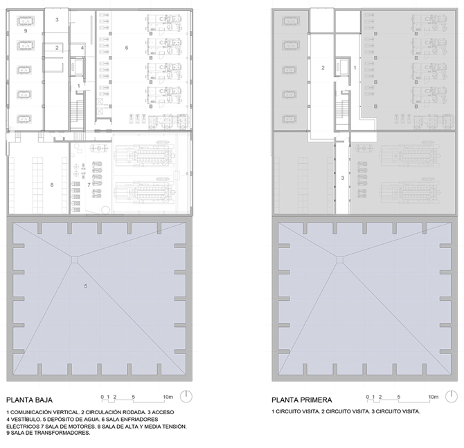 Adoptamos dos estrategias: disciplinarla dentro de la ordenación volumétrica general y hacerla comprensible mediante la posibilidad del acceso público y la expresión de su funcionamiento hacia el exterior. El objetivo de la instalación es la optimización de la producción de frío y calor centralizándola, utilizando el agua del río para la refrigeración y cogenerando energía eléctrica.