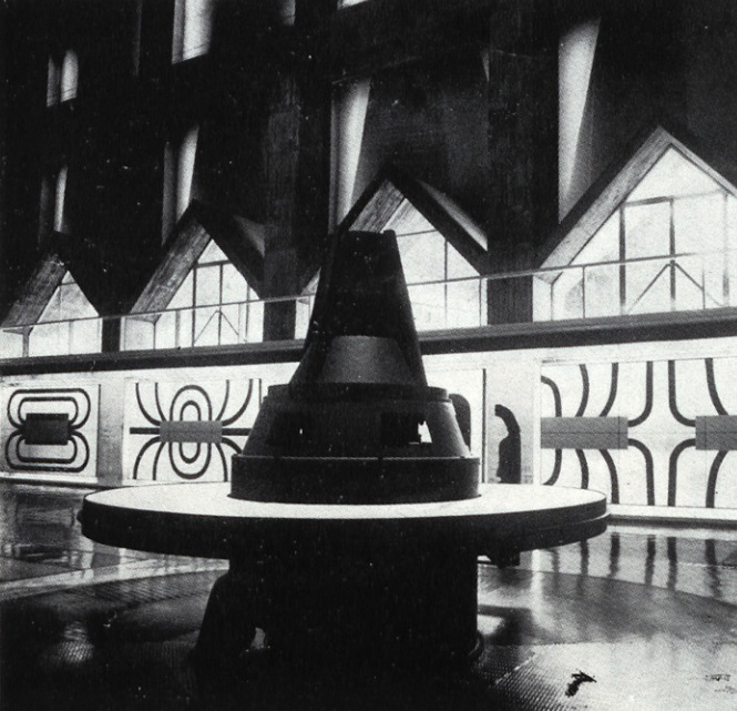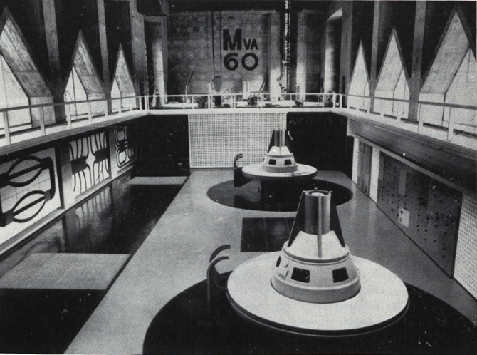 En las plantas subterráneas de alternadores y de turbinas se ha tratado de conseguir un interés plástico jugando con los colores funcionales establecidos internacionalmente para esta clase de instalaciones y con una iluminación localizada en los puntos necesarios, dejando en penumbra el ámbito general. En la planta de excitatrices o “sala de máquinas” se han pintado seis grandes murales de temas basados en esquemas eléctricos y con un colorido también esquemático.