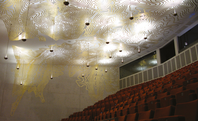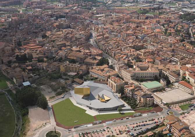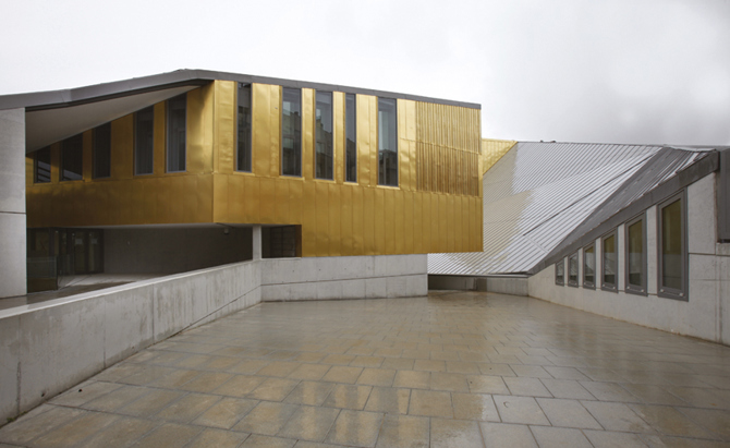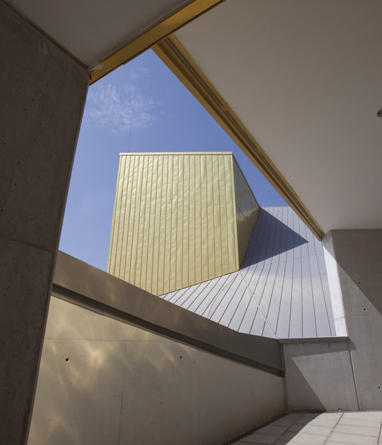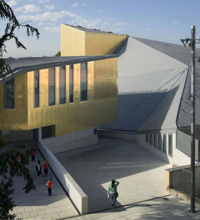 - Entre los materiales –hormigón, piedra natural de basalto, aluminio, etc.– hemos introducido en las fachadas más altas de la torre volante y de la Escuela de Música, un revestimiento metálico, una aleación de cobre y aluminio, que conduce la mirada hacia el skyline del complejo y de ahí a la ciudad de Vic.