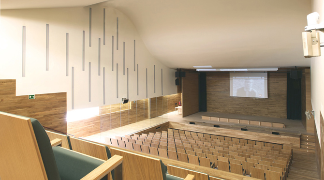 La volumetría exterior del complejo cultural, recubierta de una elegante piel de zinc, se configura como un cuerpo rotundo solo fragmentado por la irrupción de la sala de actos y el vaciado central que sirve como patio de entrada.